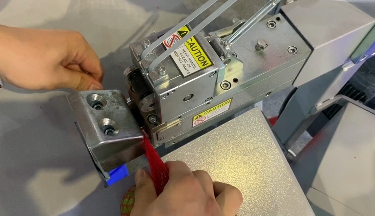 เครื่องบรรจุถุงตาข่ายสำหรับหัวหอม ผลไม้ และมันฝรั่งแบบกึ่งอัตโนมัติเครื่องบรรจุถุงตาข่าย